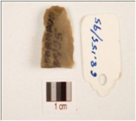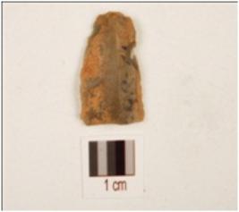 | Description / विवरण | Fragment of blade, made on chert with single ridge on dorsal side, triangular in section, partly chipped off bulb and use wear marks on cutting edge. |
