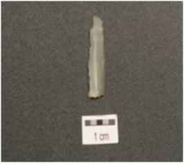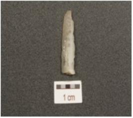 | Description / विवरण | Fragment of a blade, made of chalcedony, broken irregular retouch on cutting edge on dorsal and ridge on dorsal. |