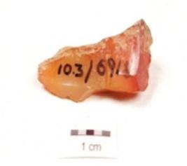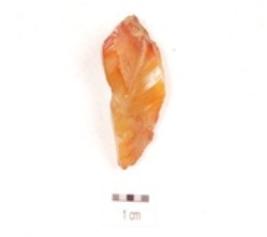 | Description / विवरण | A small bifacial point made on chalcedony with tapering, pointed end, ripple marks on the surface, slightly damaged tip. |