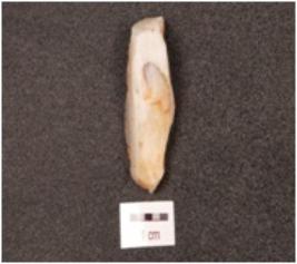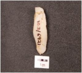 | Description / विवरण | A blade made on chalcedony with broad at the proximal end and thin and pointed distal end, use-ware marks along the cutting edge at one end. |