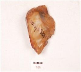 | Description / विवरण | A side scraper prepared on an end struck flake with ripple marks on the surface, cortex on one face, use-ware marks along the cutting edges. |
