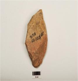 | Description / विवरण | A flake made on quartzite flake triangular in shape, prepared platform, flake scars on surface. |