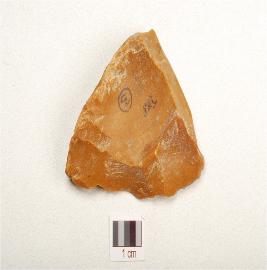 | Description / विवरण | A side struck utilized flake made on chert with flake scars on dorsal prepared platform, rectangular in section and use wear marks on edges. |