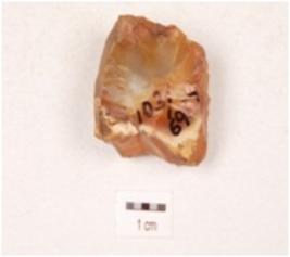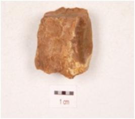 | Description / विवरण | A core made on chalcedony with flake scars on the surface and heat treated, cortex on the exterior. |