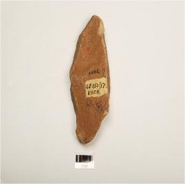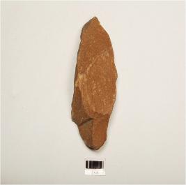 | Description / विवरण | A handaxe made on side struck quartzite flake, flake scars on both sides, prepared platform, diffused bulb on ventral side, plano convex in section. |