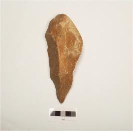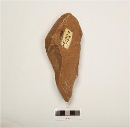 | Description / विवरण | A handaxe made on end struck quartzite flake, flake scars on both sides, prepared platform, cortex on one side, prominent bulb on ventral side, pointed one end, plano convex in section. |