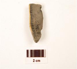 | Description / विवरण | Flake made on chert, flake scars on dorsal side, triangular section, ventral side bulb defused, blunt cutting edge. |