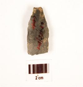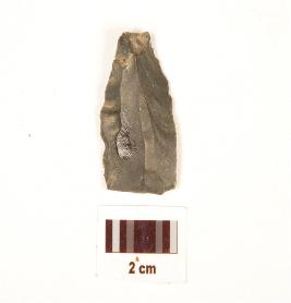 | Description / विवरण | Fragment of a blade, made on chert with single ridge on dorsal side, bulb on ventral, use wear marks on cutting edge and triangular in section. |