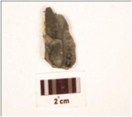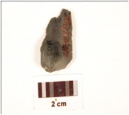 | Description / विवरण | A utilized flake, made on chert with flake scars on dorsal side, use wear marks on working edge and prepared platform, bulb on ventral. |