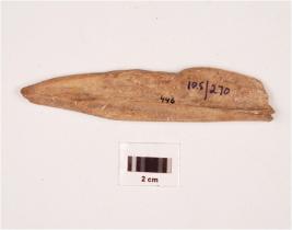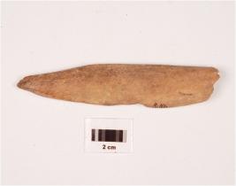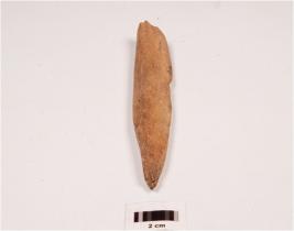 | Description / विवरण | Bone fragment partly broken, smooth surface, chipped off from the top. |