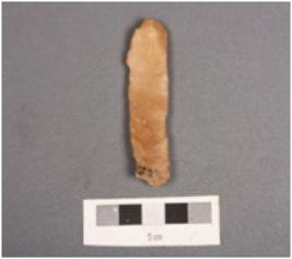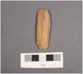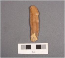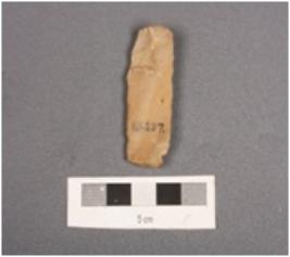 | Description / विवरण | Parallel sided chert blade, two ridges on dorsal, use wear mark along cutting edges, defused bulb on proximal end. |