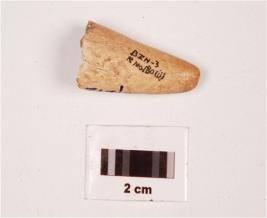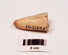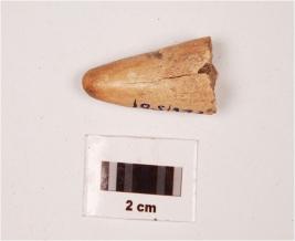| Description / विवरण | A bone point conical in shape, one end is pointed, slightly chipped off from surface, cracks on surface, bottom is broken, off white in colour. |