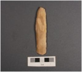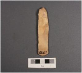 | Description / विवरण | Parallel sided chert blade, two ridges on dorsal, use wear mark along cutting edges, prominent bulb on ventral side, distal end broken. |