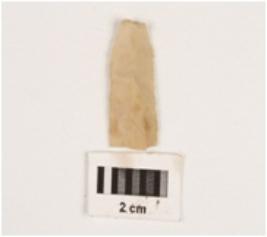 | Description / विवरण | It s a chert blade, double ridge on dorsal side, trapezoidal in section, bulb on ventral side, broken from distal end, use wear mark along the cutting edges. |
