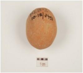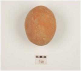 | Description / विवरण | Terracotta sling ball with slightly uneven surface and red slipped. |