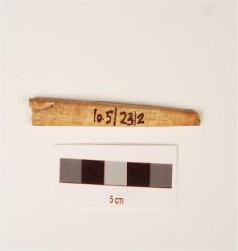 | Description / विवरण | Fragment of a bone point with rectangular-cross section, broken at one end, another end pointed, polished, smooth surface. |