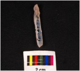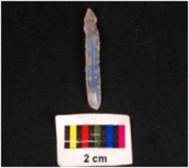 | Description / विवरण | Parallel sided blade made on chalcedony stone, mid ridge on dorsal surface ventral surface is smooth with diffuse at proximal end, use wear marks on edge. |
