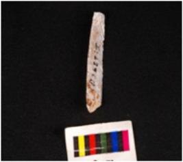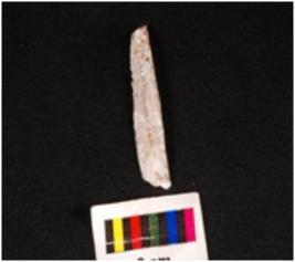 | Description / विवरण | Parallel sided blade with double ridge on dorsal surface, partly broken proximal end with pertially present diffused bulb, broken from distal end, use-wear marks along the cutting edge. |