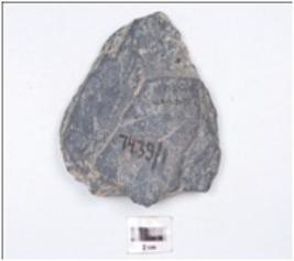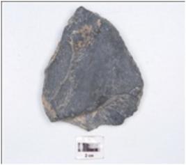 | Description / विवरण | Flake of schist, smooth and polished surface and irregular rough edges. |