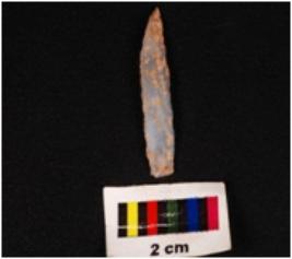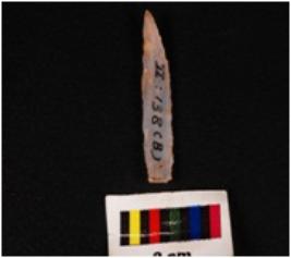 | Description / विवरण | A Point made on chalcedony with two parallel ridge on the dorsal side, irregular retouch on cutting edges, use-ware marks and pointed end, trapezoidal in section. |
