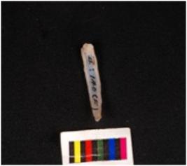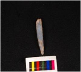| Description / विवरण | Point on blade with two ridge on dorsal surface, slightly broken & pointed distal end, intact & diffused bulb on proximal end, use-wear marks, along the cutting edge. |