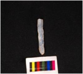| Description / विवरण | Parallel sided blade with vertical ridge on dorsal surface, broken proximal end, intact distal end, use-wear marks along the cutting edge. |