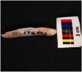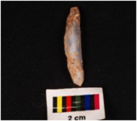 | Description / विवरण | A parallel sided blade made on chalcedony with a ridge on the dorsal side, prominent bulb, prepared platform and irregular cutting edges, broken at distal end. |