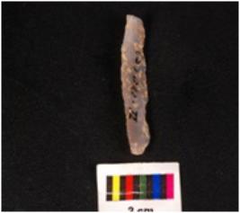 | Description / विवरण | A chalcedony blade with a mid-ridge on dorsal side, triangular section, diffused bulb on ventral side, use-wear marks along the cutting edges and raw material was given heat treatment. |