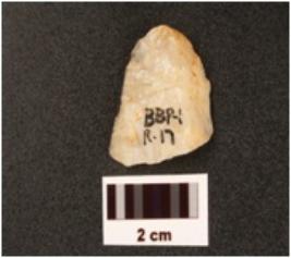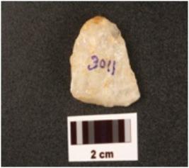 | Description / विवरण | A side scraper, made with and struck flake prepared platform on proximal end, distal end is pointed and use wear marks on edges. |