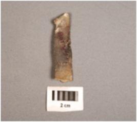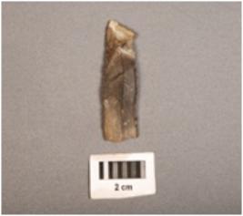 | Description / विवरण | Pen knife shaped chert blade, two ridges on dorsal side, use wear edges, diffused bulb on proximal end, black in colour due to heat treatment. |