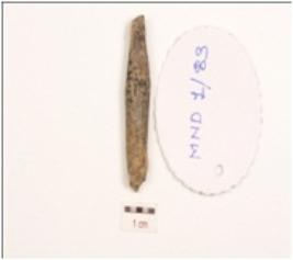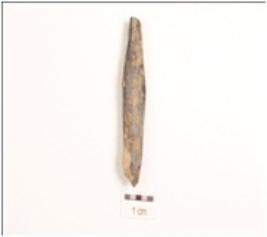 | Description / विवरण | Bone point, partly broken end, unfinished, rough surface and charred condition. |