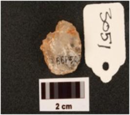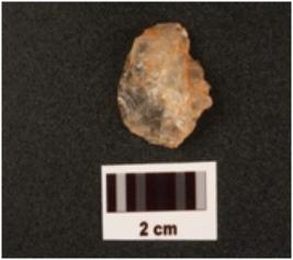 | Description / विवरण | Scraper made on quartz with irregular retouched marks along cutting edges, flake scars on dorsal side and prepared platform. |