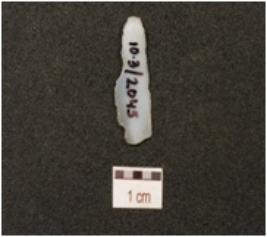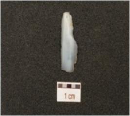 | Description / विवरण | A chalcedony blade with double ridge on dorsal, trapezoidal cross section, bulb on ventral, prepared platform, use wear marks and broken along distal end. |