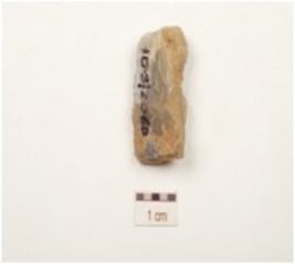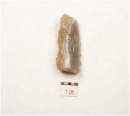 | Description / विवरण | A chalcedony blunted blade with mid ridge on dorsal, prepared platform, triangular cross section and use wear marks on one cutting edge. |