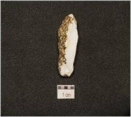 | Description / विवरण | A chert blunted blade with cortex on dorsal, striking platform, diffused bulb on ventral and triangular cross section. |