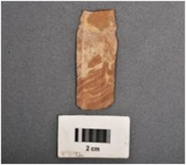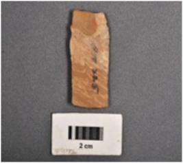 | Description / विवरण | Parallel sided chert blade, double ridge on dorsal side, trapezoidal in section, broken at distal and proximal end, use wear mark along the cutting edges. |