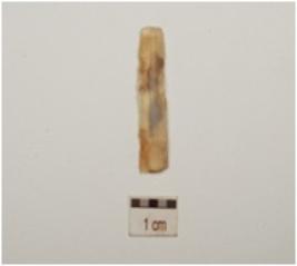 | Description / विवरण | A blade made on chalcedony, prepared platform on proximal end, single ridge on dorsal side, use marks on working edges and triangular cross section. |