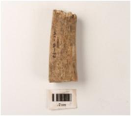 | Description / विवरण | A bone point with rough surface and crack marks. Base is flat and has a perforation at bottom. |