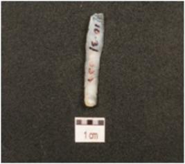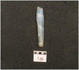 | Description / विवरण | A parallel sided chalcedony blade with prominent mid ridge on dorsal, triangular cross section, bulb on ventral, striking platform, use wear marks on cutting edge and broken along distal end. |