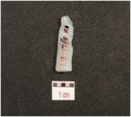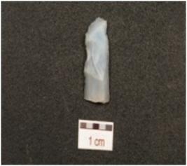 | Description / विवरण | Fragment of blade with single ridge on dorsal, triangular cross section, use wear marks on cutting edge and broken along proximal end. |