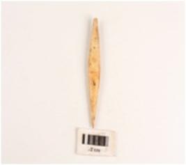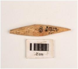 | Description / विवरण | A bone point with one broken tip, one side is flat, smooth surface. |
