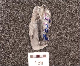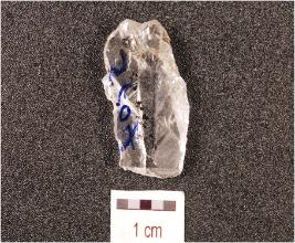 | Description / विवरण | A flake made of quartz crystal, flake scars on the dorsal transparent, smooth surface and wavy cutting edges. |