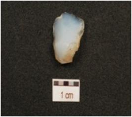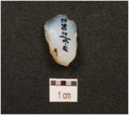 | Description / विवरण | A chalcedony utilized flake with prepared platform, chipped off surface and use wear marks on edges. |