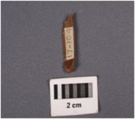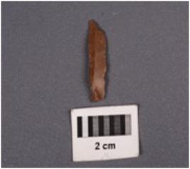 | Description / विवरण | Fragment of a parallel sided blade with a ridge on dorsal surface, diffused bulb on ventral surface, prepared platform on proximal end, partly broken along distal end, use-wear marks along the cutting edge. |
