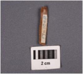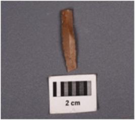 | Description / विवरण | Fragment of a parallal sided blade, with a ridge on dorsal surface, diffused bulb on ventral surface, prepared platform, partly broken along distal end, use-wear marks along cutting edges. |