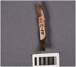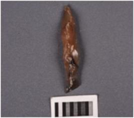 | Description / विवरण | Fragment of a point with a ridge on dorsal surface, partly broken proximal and distal end, use-wear marks along the cutting edge. |
