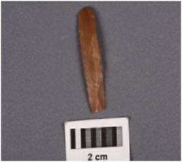 | Description / विवरण | A parallel sided blade with two ridge on dorsal surface, diffused bulb on ventral surface, prepared platform, use-wear marks along cutting edges. |