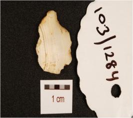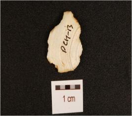 | Description / विवरण | A agate end struck utilized flake with prepared platform, bulb on ventral and use-wear marks on edge. |