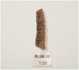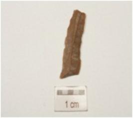 | Description / विवरण | A blade made of chert with a mid ridge, triangular in cross-section and use-wear marks along the cutting edges. |