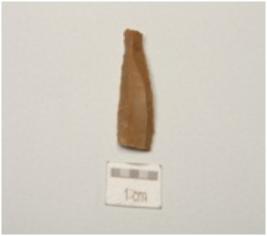 | Description / विवरण | A blade made of chert with double ridge on dorsal side, trapezoidal cross-section and use-wear makrs along the cutting edges. |